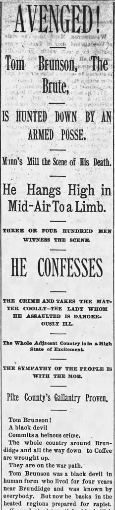 “Avenged! Tom Brunson, The Brute, is Hunted Down by an Armed Posse,” Troy Messenger, 16 Mar 1893, p. 5.